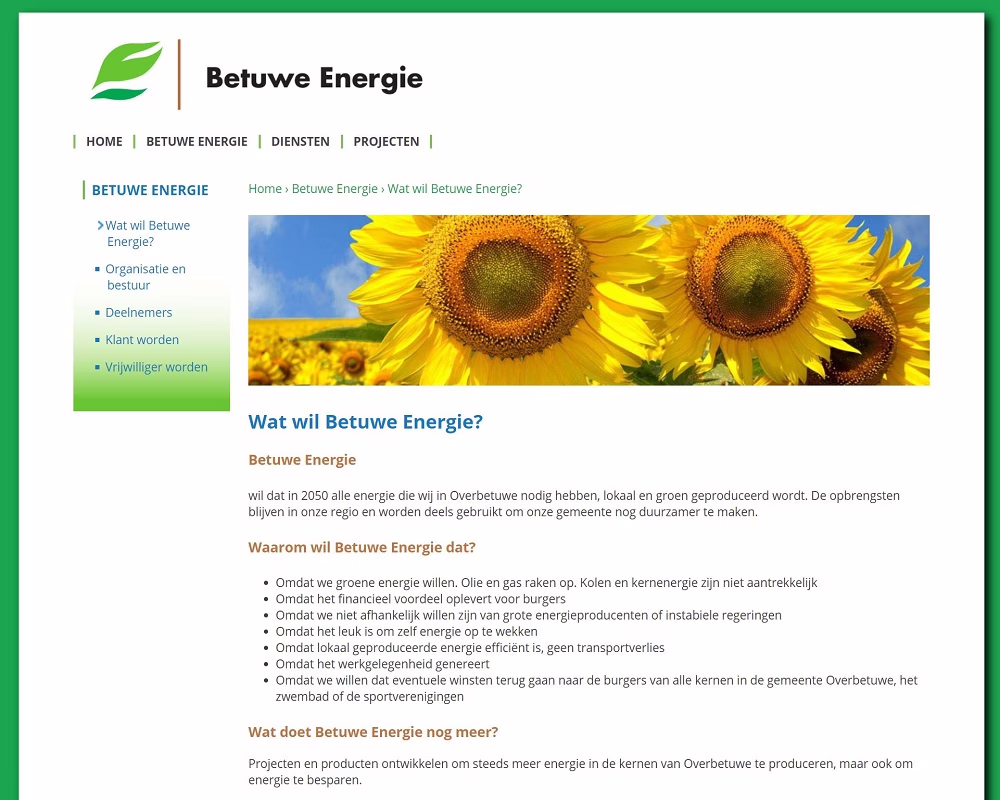 Stichting Betuwe Energie heeft zich tot doel gesteld om alle energie die in de gemeente Overbetuwe in 2050 nodig is lokaal en groen te produceren. De opbrengsten moeten in de regio blijven en worden gebruikt om de gemeente nog duurzamer te maken.